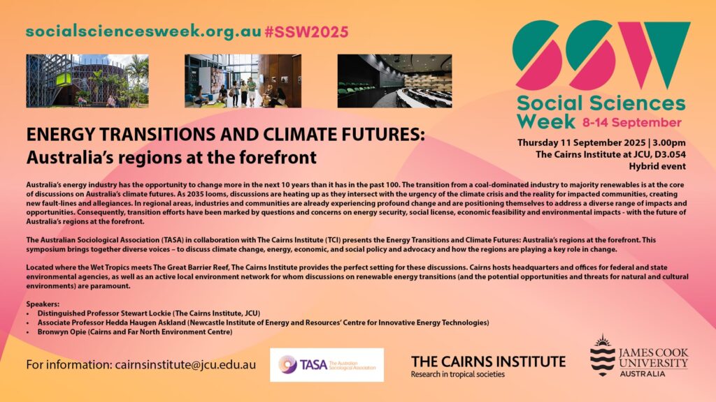 The Australian Sociological Association (TASA) in collaboration with The Cairns Institute (TCI) presents the Energy Transitions and Climate Futures: Australia’s regions at the forefront. This symposium brings together diverse voices – to discuss climate change, energy, economic, and social policy and advocacy and how the regions are playing a key role in change.
