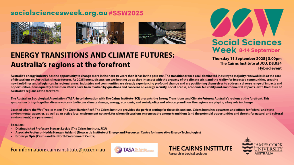 The Australian Sociological Association (TASA) in collaboration with The Cairns Institute (TCI) presents the Energy Transitions and Climate Futures: Australia’s regions at the forefront. This symposium brings together diverse voices – to discuss climate change, energy, economic, and social policy and advocacy and how the regions are playing a key role in change.