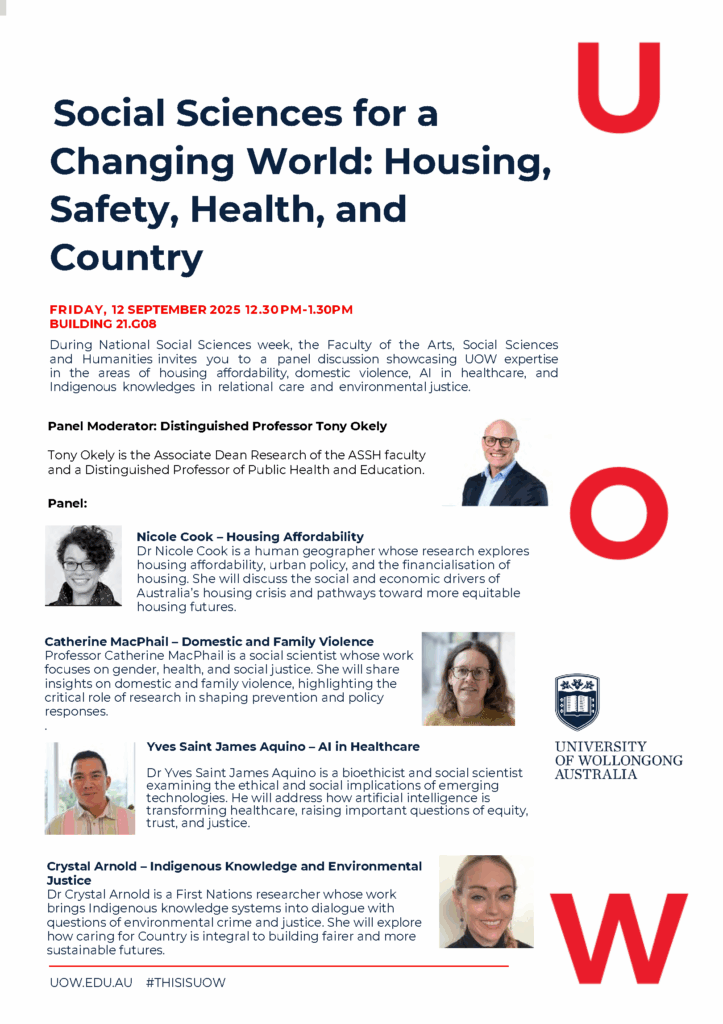 As part of Social Sciences Week 2025, the Faculty of the Arts, Social Sciences and Humanities at the University of Wollongong invites you to our flagship panel event, Social Sciences for a Changing World: Housing, Safety, Health, and Country. This panel will feature UOW researchers Dr Nicole Cook, Professor Catherine MacPhail, Dr Yves Saint James Aquino, and Dr Crystal Arnold, who will share insights on housing affordability, domestic and family violence, AI in healthcare, and Indigenous knowledge and environmental justice. Join us for a thought-provoking discussion on how social sciences are shaping fairer, healthier, and more sustainable futures.